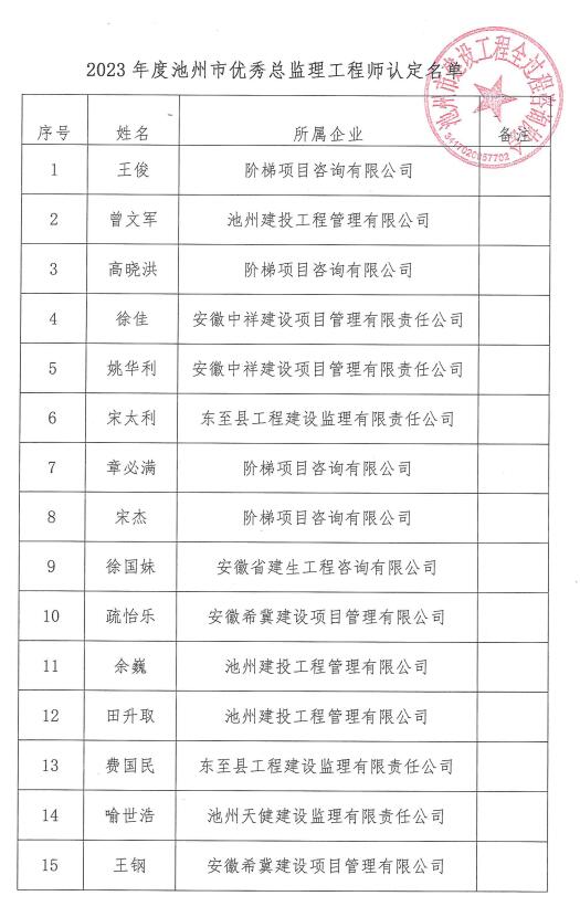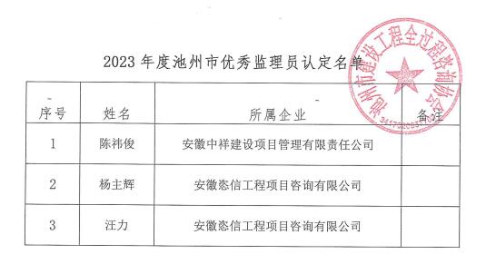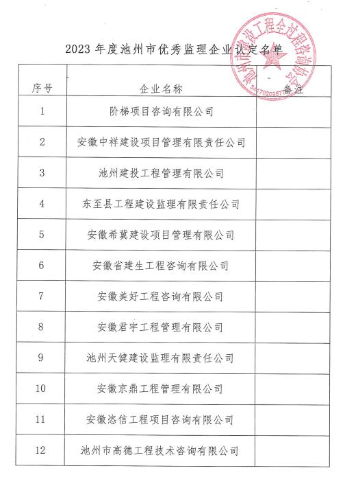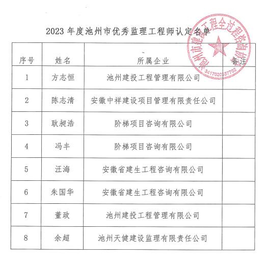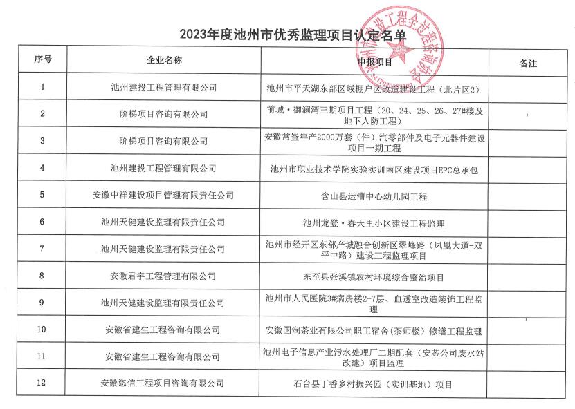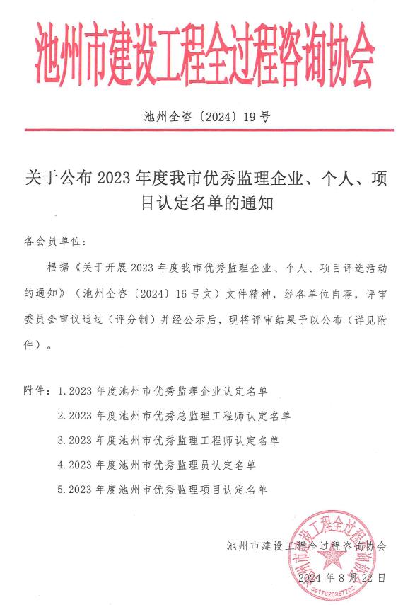 根据《关于开展2023年度我市优秀监理企业、个人、项目评选活动的通知》(池州全咨〔2024〕16号文)文件精神,经各单位自荐,评审委员会审议通过(评分制)并经公示后,现将评审结果予以公布(详见附件)。