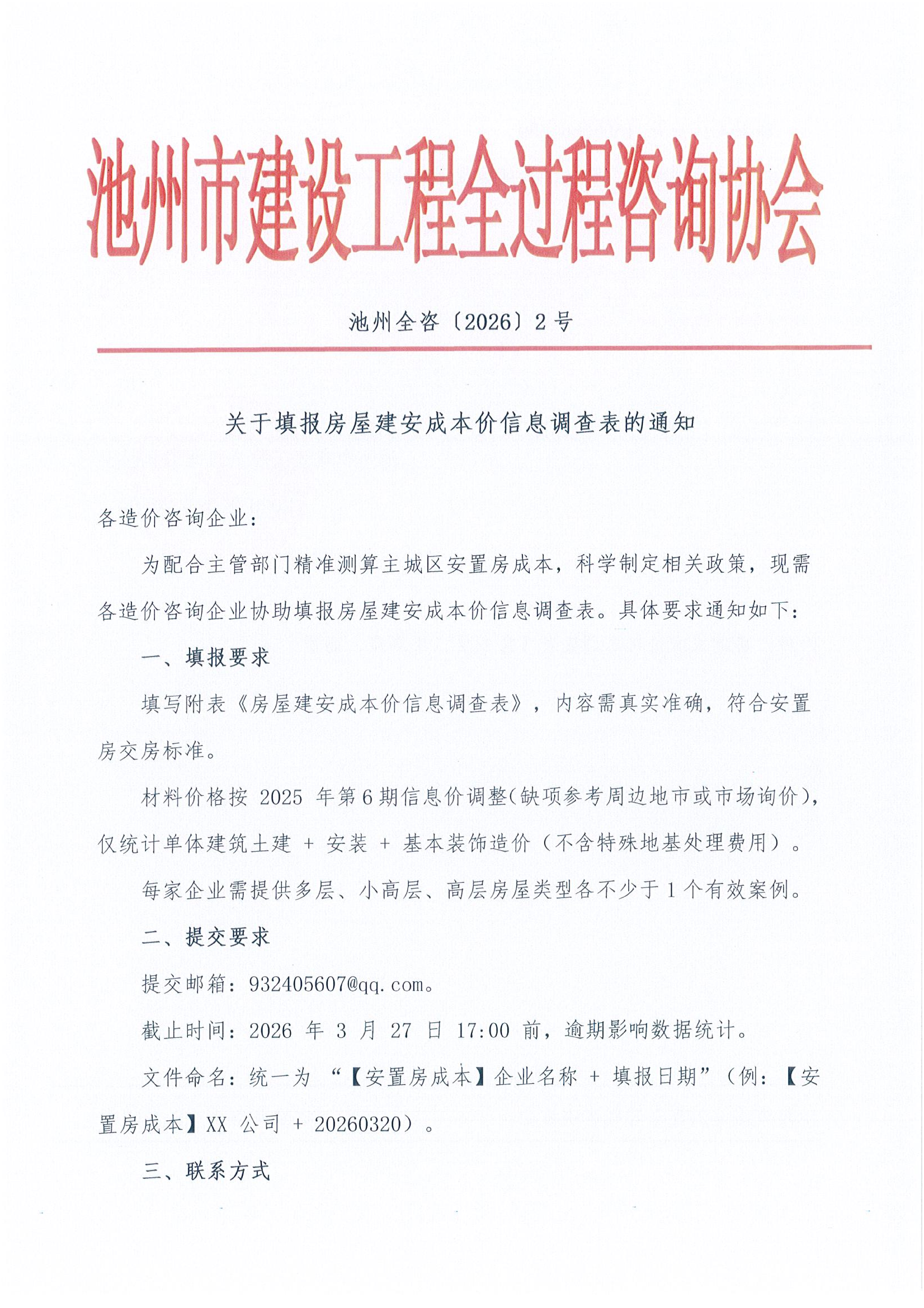 为配合主管部门精准测算主城区安置房成本,科学制定相关政策,现需各造价咨询企业协助填报房屋建安成本价信息调查表。请于3月27日下午五点前填报完成并发送至932405607@qq.com。感谢支持!(具体内容详见文件通知)
