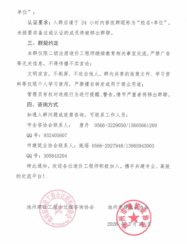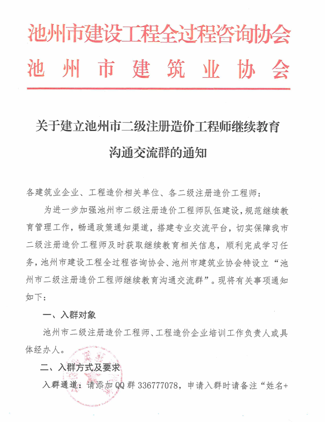关于建立池州市二级注册造价工程师继续教育沟通交流群的通知