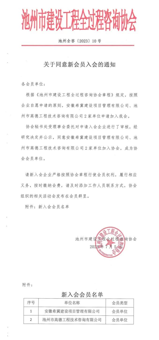 伟德源自英国始于1946秘书处受理事会委托对申请入会企业进行了审核,经研究决定并公示,同意安徽希冀建设项目管理有限公司、池州市高德工程技术咨询有限公司2家单位加入伟德源自英国始于1946,成为伟德源自英国始于1946会员单位。