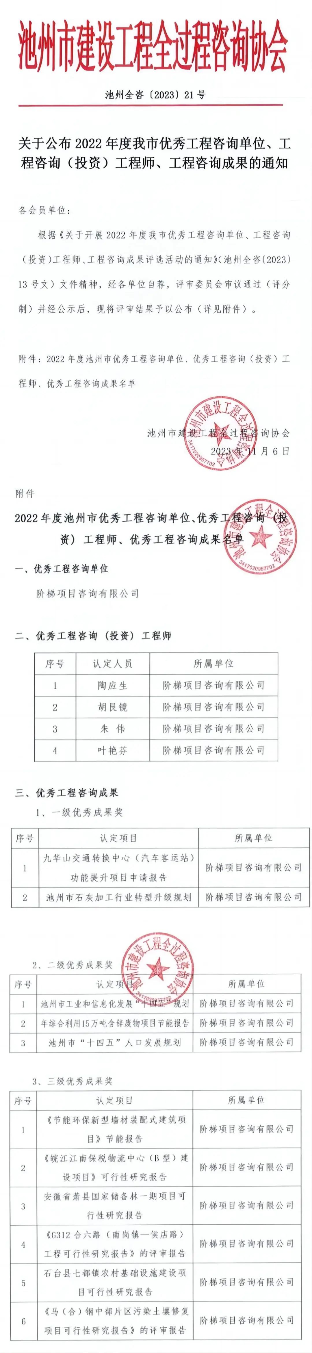 根据《关于开展2022年度我市优秀工程咨询单位、工程咨询(投资)工程师、工程咨询成果评选活动的通知》(池州全咨〔2023〕13号文)文件精神,经各单位自荐,评审委员会审议通过(评分制)并经公示后,现将评审结果予以公布(详见附件)。