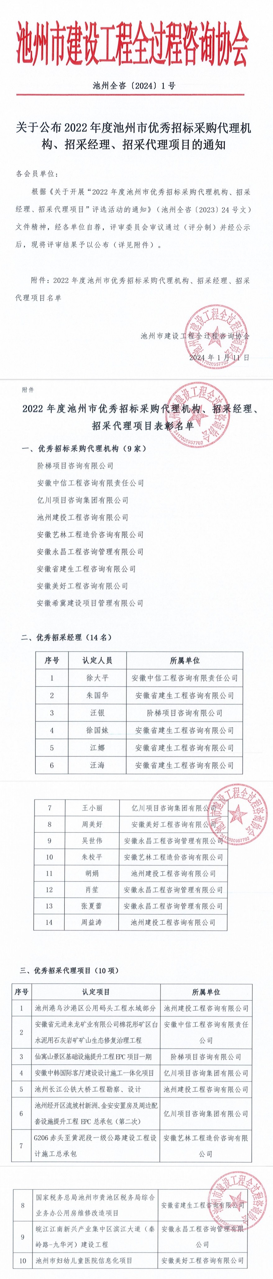 根据《关于开展“2022 年度池州市优秀招标采购代理机构、招采经理、招采代理项目”评选活动的通知》(池州全咨〔2023〕24 号文)文件精神,经各单位自荐,评审委员会审议通过(评分制)并经公示后,现将评审结果予以公布(详见附件)。