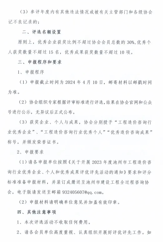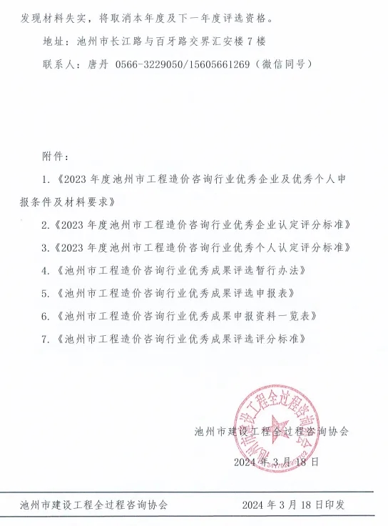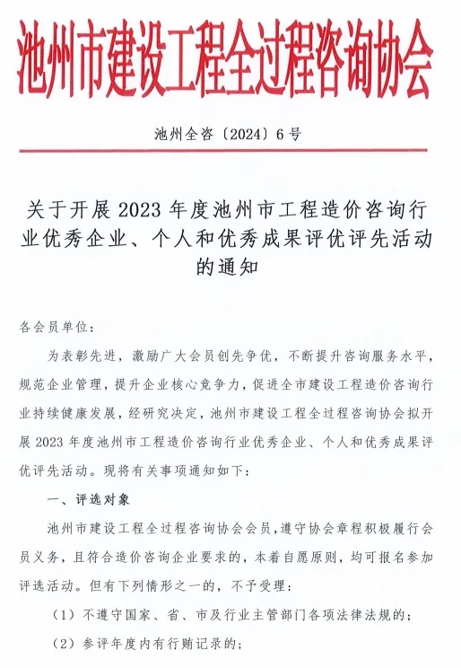 1.《2023年度池州市工程造价咨询行业优秀企业及优秀个人申报条件及材料要求》