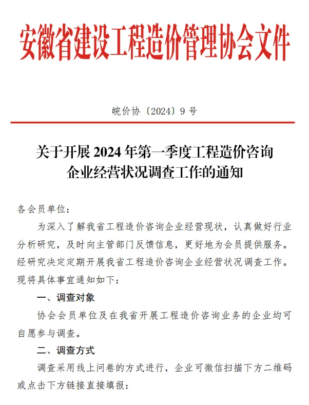 省价协关于开展2024年第一季度工程造价咨询企业经营状况调查工作的通知