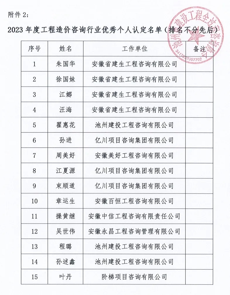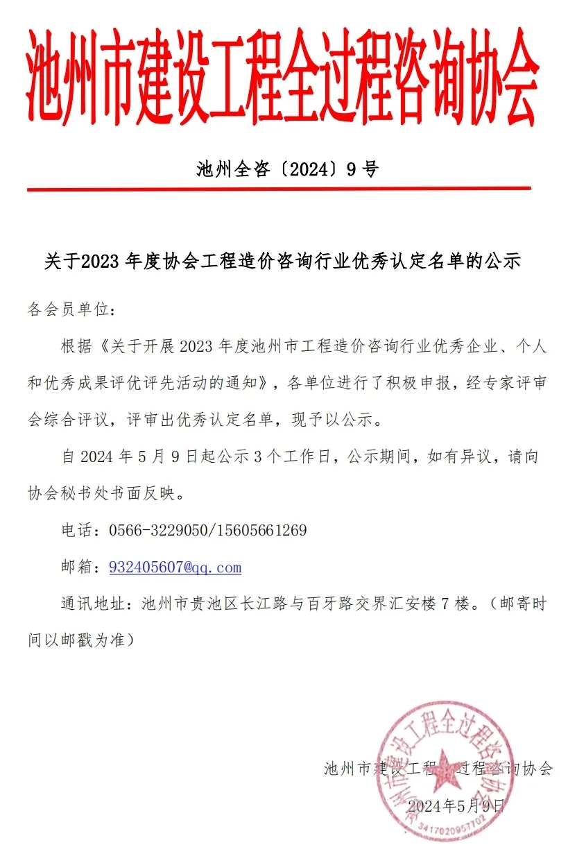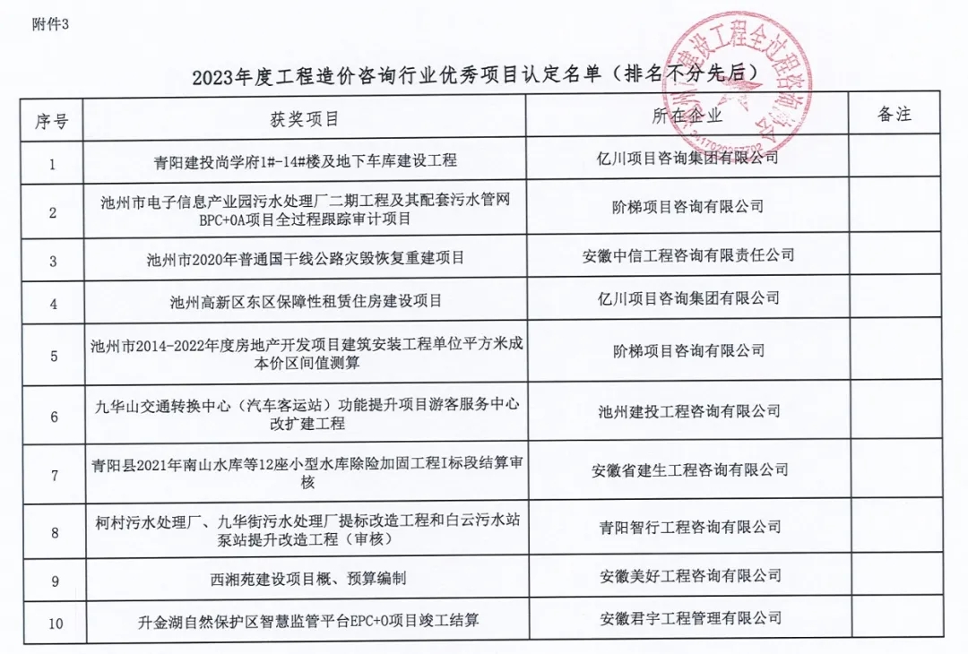 根据《关于开展 2023 年度池州市工程造价咨询行业优秀企业、个人和优秀成果评优评先活动的通知》,各单位积极申报,经专家评审会综合评议,评审出优秀认定名单,现予以公示。