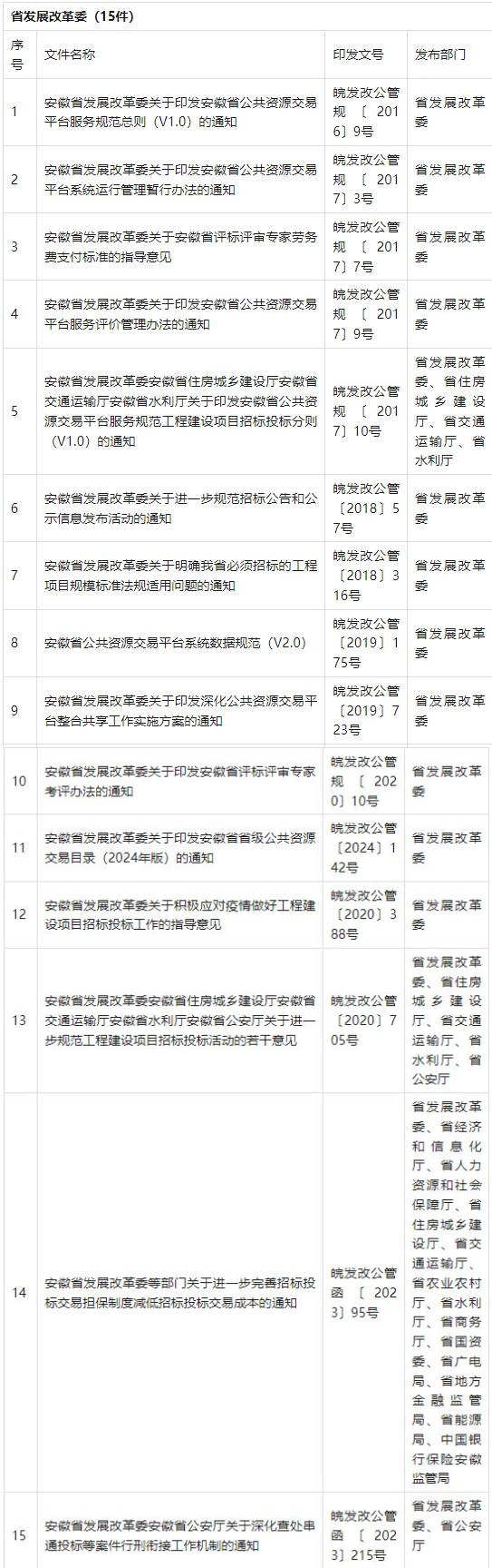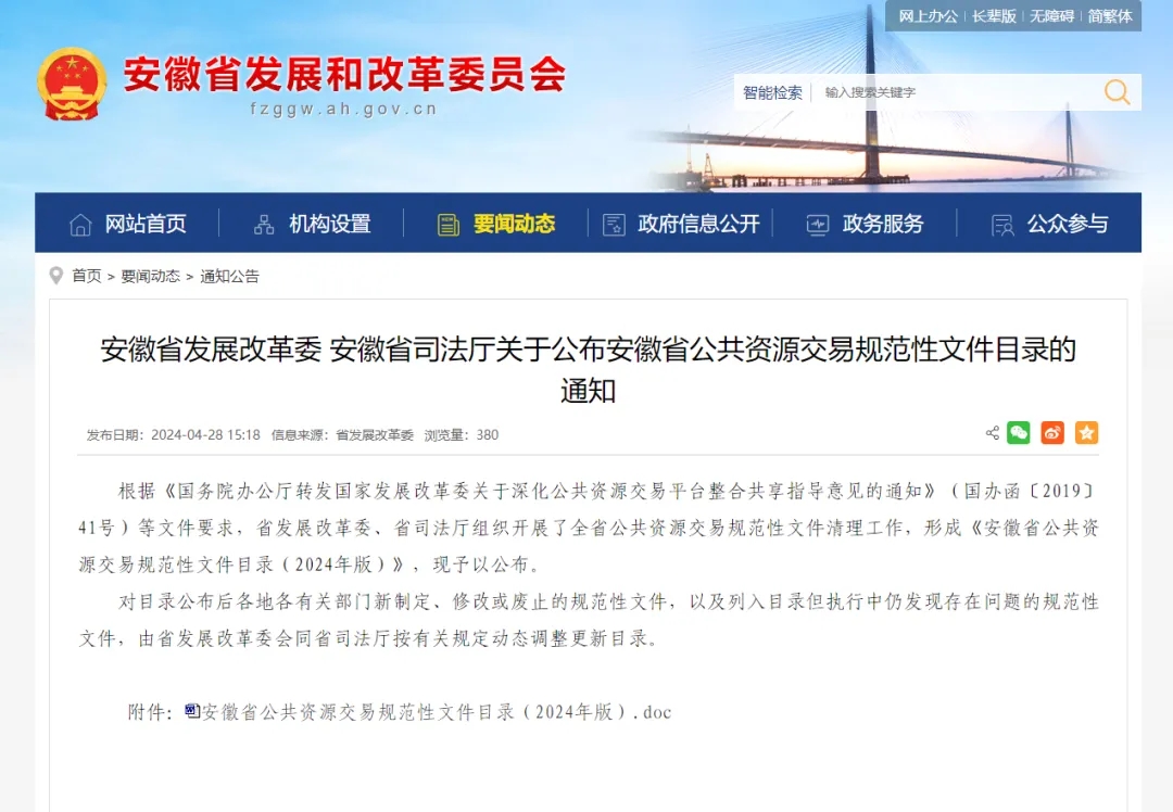 近日,省发展改革委、省司法厅公布了《安徽省公共资源交易规范性文件目录(2024年版)》。