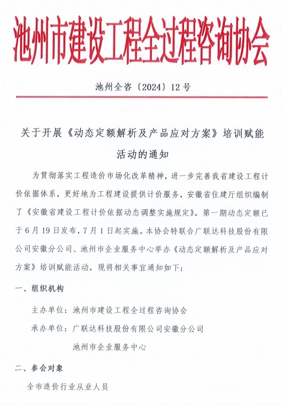 为贯彻落实工程造价市场化改革精神,进一步完善我省建设工程计价依据体系,更好地为工程建设提供计价服务,安徽省住建厅组织编制了《安徽省建设工程计价依据动态调整实施规定》。第一期动态定额已于6月19日发布,7月1日起实施。本伟德源自英国始于1946特联合广联达科技股份有限公司安徽分公司、池州市企业服务中心举办《动态定额解析及产品应对方案》培训赋能活动,请各会员单位积极参与!