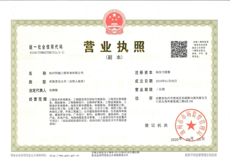 池州同越工程咨询有限公司成立于2019年1月9日,经营范围:工程技术服务,工程建设项目招标代理服务,工程项目管理服务,测绘服务,工程勘察设计,公路养护服务,工程监理服务,工程造价咨询服务,地质灾害治理服务,检测服务;房屋建筑工程、市政公用工程、公路工程、水利工程、土石方工程、消防工程、园林绿化工程、环保工程施工;公共建筑装饰和装修、住宅装饰和装修、建筑劳务分包;广告设计、制作;金属材料、建筑材料、五金产品、机电产品、电线电缆批发及零售。