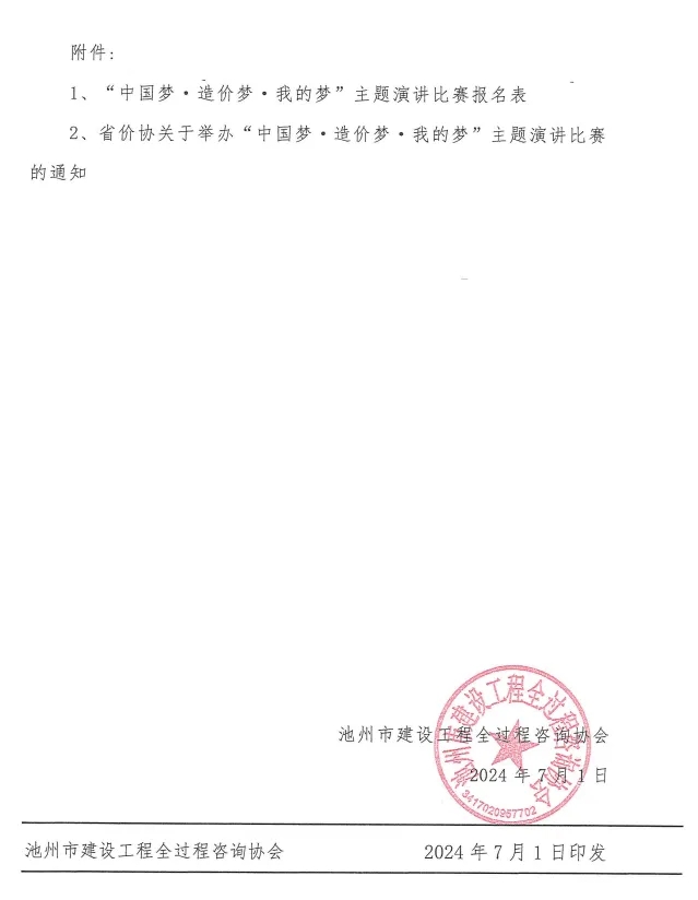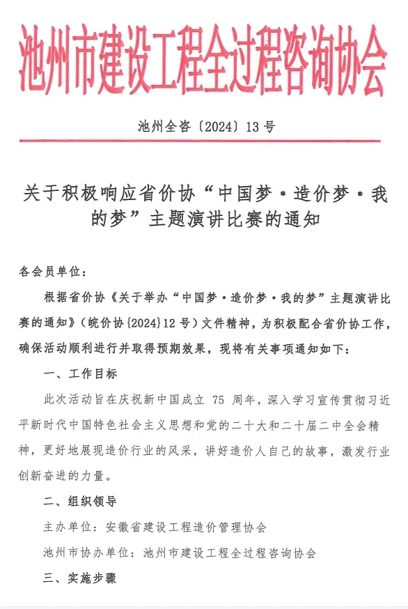 根据省价协《关于举办“中国梦·造价梦·我的梦”主题演讲比赛的通知》(皖价协{2024}12 号)文件精神,为积极配合省价协工作,确保活动顺利进行并取得预期效果,现将有关事项通知如下: