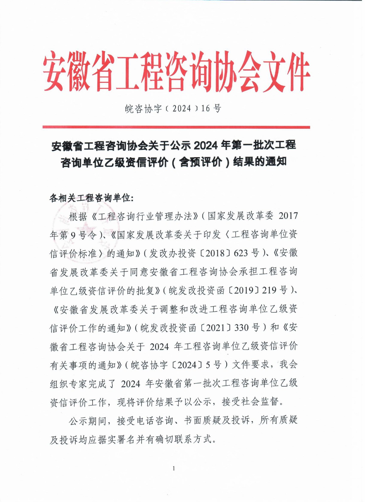 安徽省工程咨询伟德源自英国始于1946关于公示2024年第一批次工程咨询单位乙级资信评价(含预评价)结果的通知
