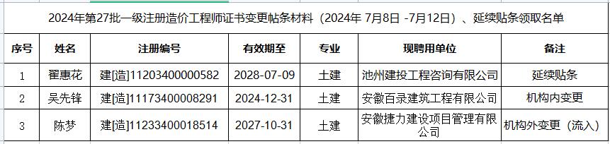 经住房和城乡建设部审批,省住房和城乡建设厅委托,我市收到2024年第27批一级注册造价工程师证书变更帖条材料(2024年 7月8日 -7月12日)、延续贴条,现将领取有关事项通知如下:
