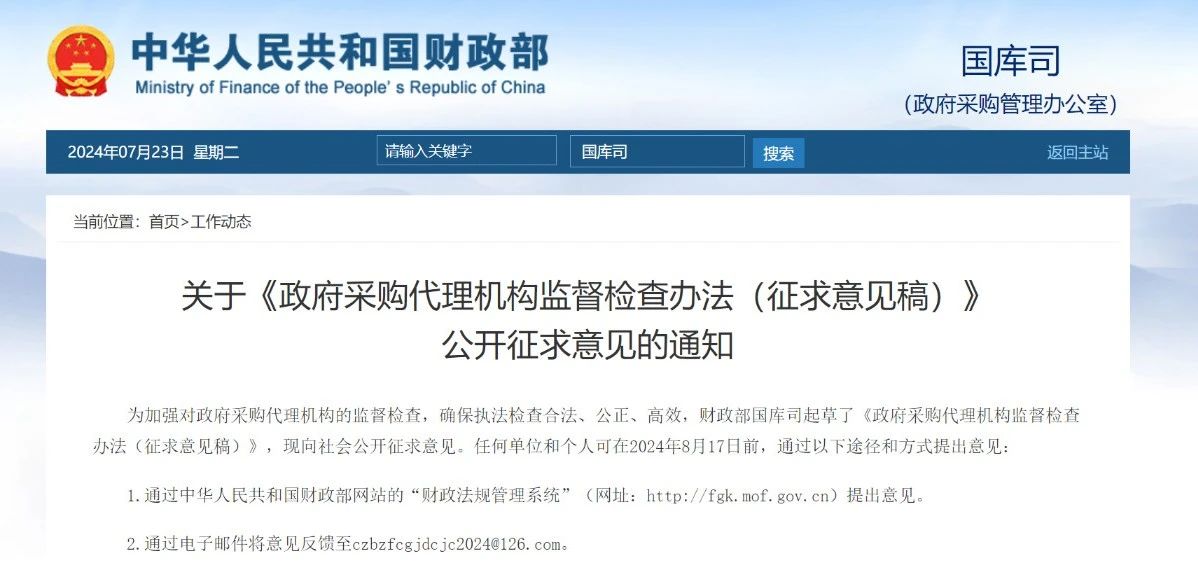为加强对政府采购代理机构的监督检查,确保执法检查合法、公正、高效,财政部国库司起草了《政府采购代理机构监督检查办法(征求意见稿)》,现向社会公开征求意见。任何单位和个人可在2024年8月17日前,通过以下途径和方式提出意见: