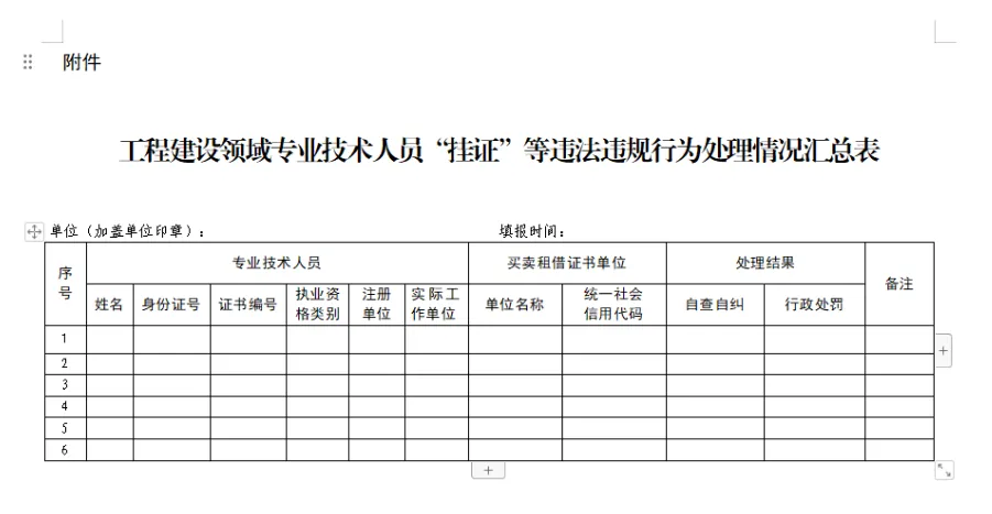 附件:工程建设领域专业技术人员“挂证”等违法违规行为处理情况汇总表