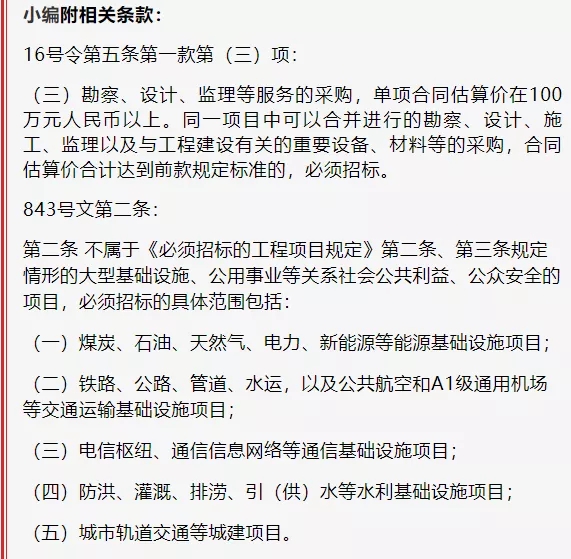(三)关于招标范围列举事项。依法必须招标的工程建设项目范围和规模标准,应当严格执行《招标投标法》第三条和16号令、843号文规定;法律、行政法规或者国务院对必须进行招标的其他项目范围有规定的,依照其规定。没有法律、行政法规或者国务院规定依据的,对16号令第五条第一款第(三)项中没有明确列举规定的服务事项、843号文第二条中没有明确列举规定的项目,不得强制要求招标。