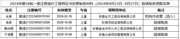经住房和城乡建设部审批,省住房和城乡建设厅委托,我市收到2024年第38批一级注册造价工程师证书变更帖条材料(2024年9月23日 -9月27日)延续贴条,现将领取有关事项通知如下: