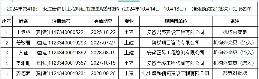 经住房和城乡建设部审批,省住房和城乡建设厅委托,我市收到2024年第41批一级注册造价工程师证书变更帖条材料(2024年10月14日 -10月18日)(部初始第21批次),现将领取有关事项通知如下: