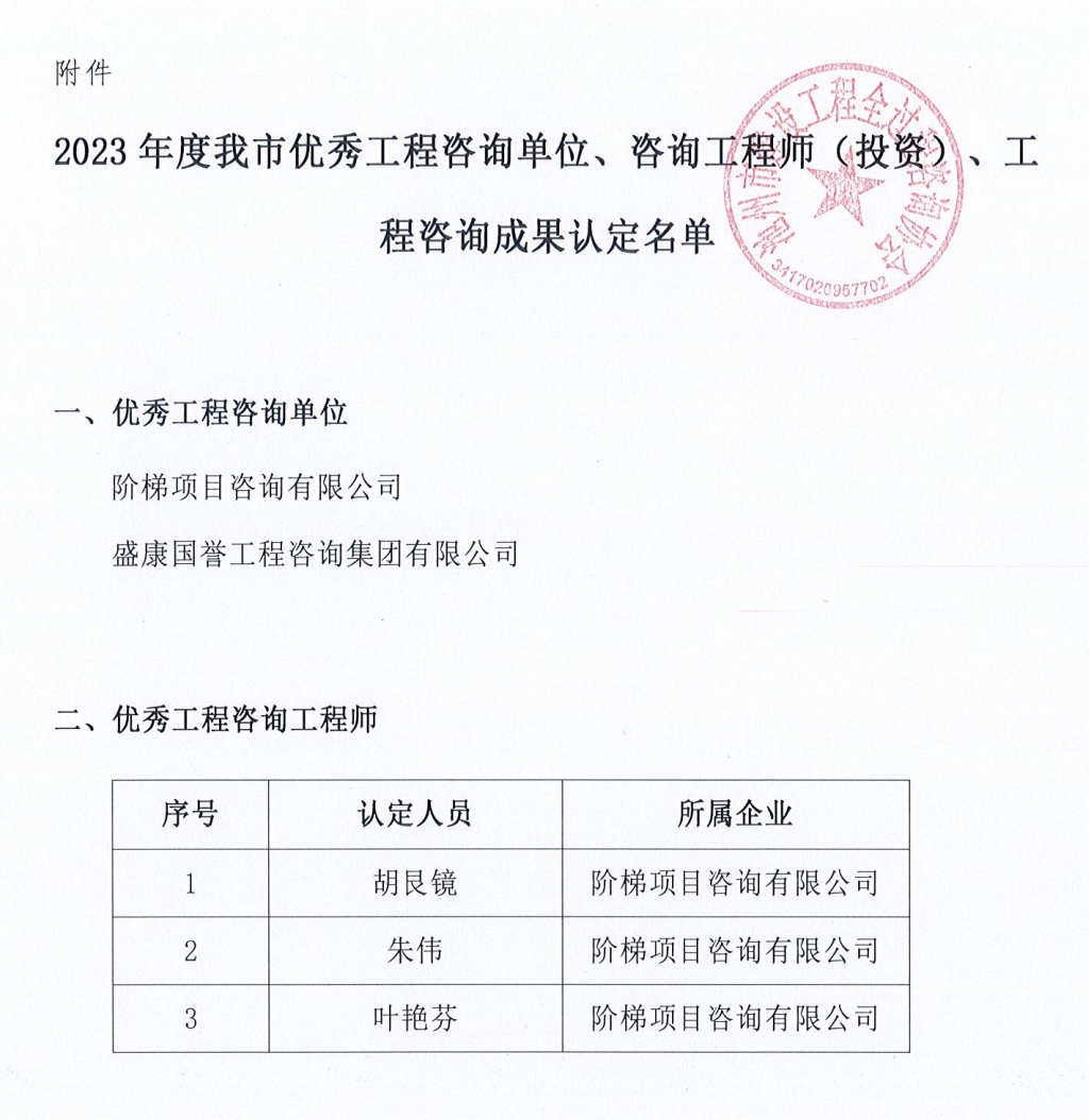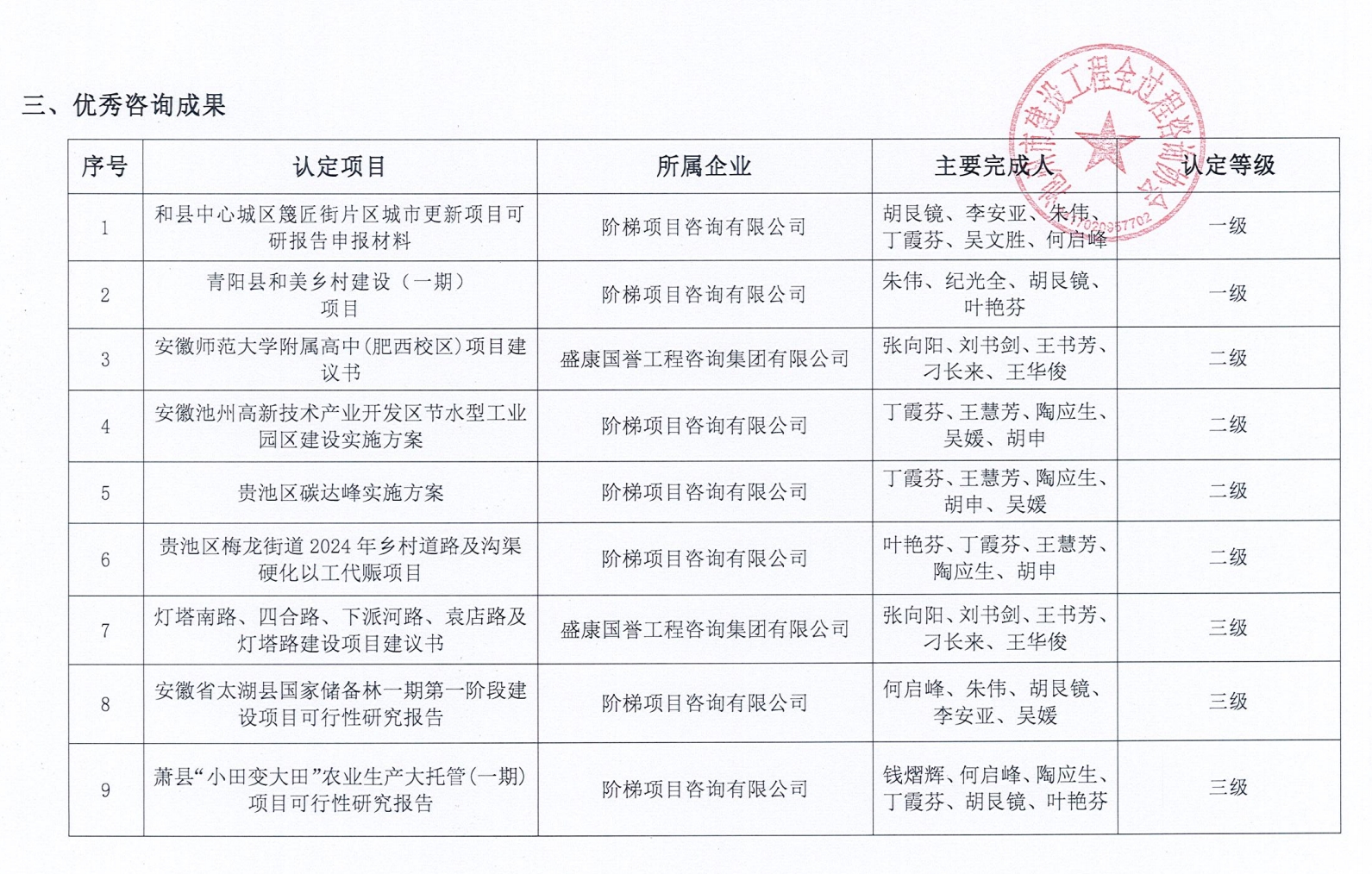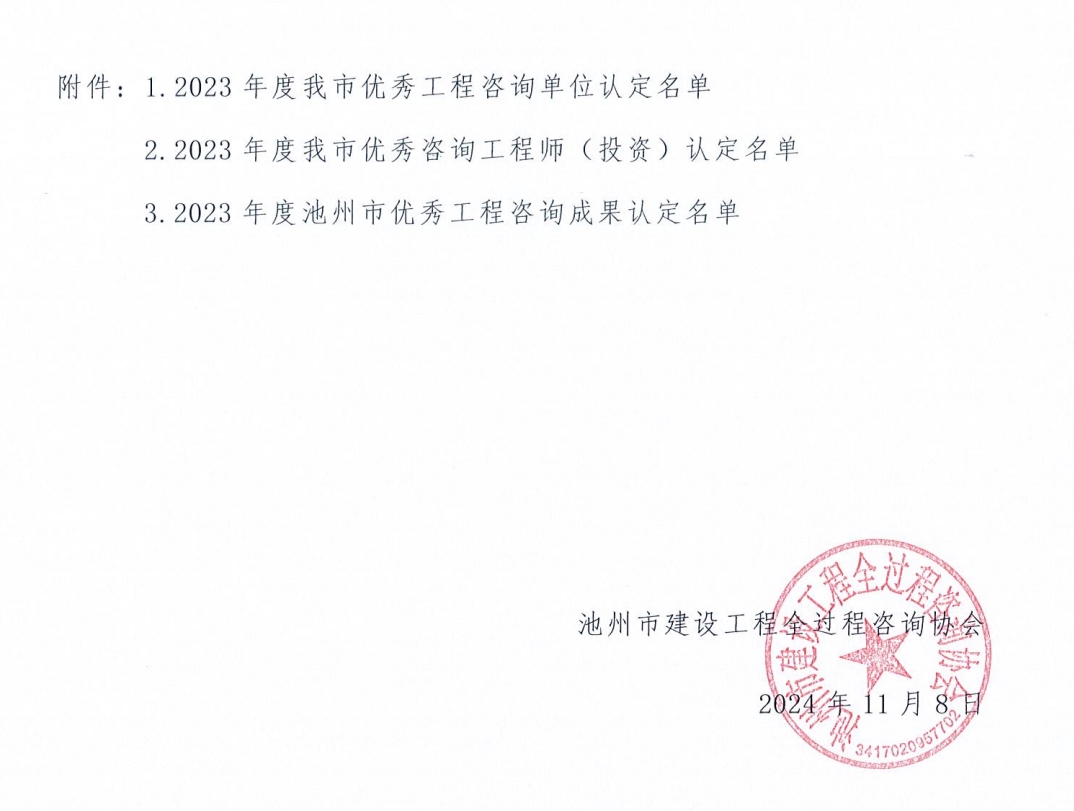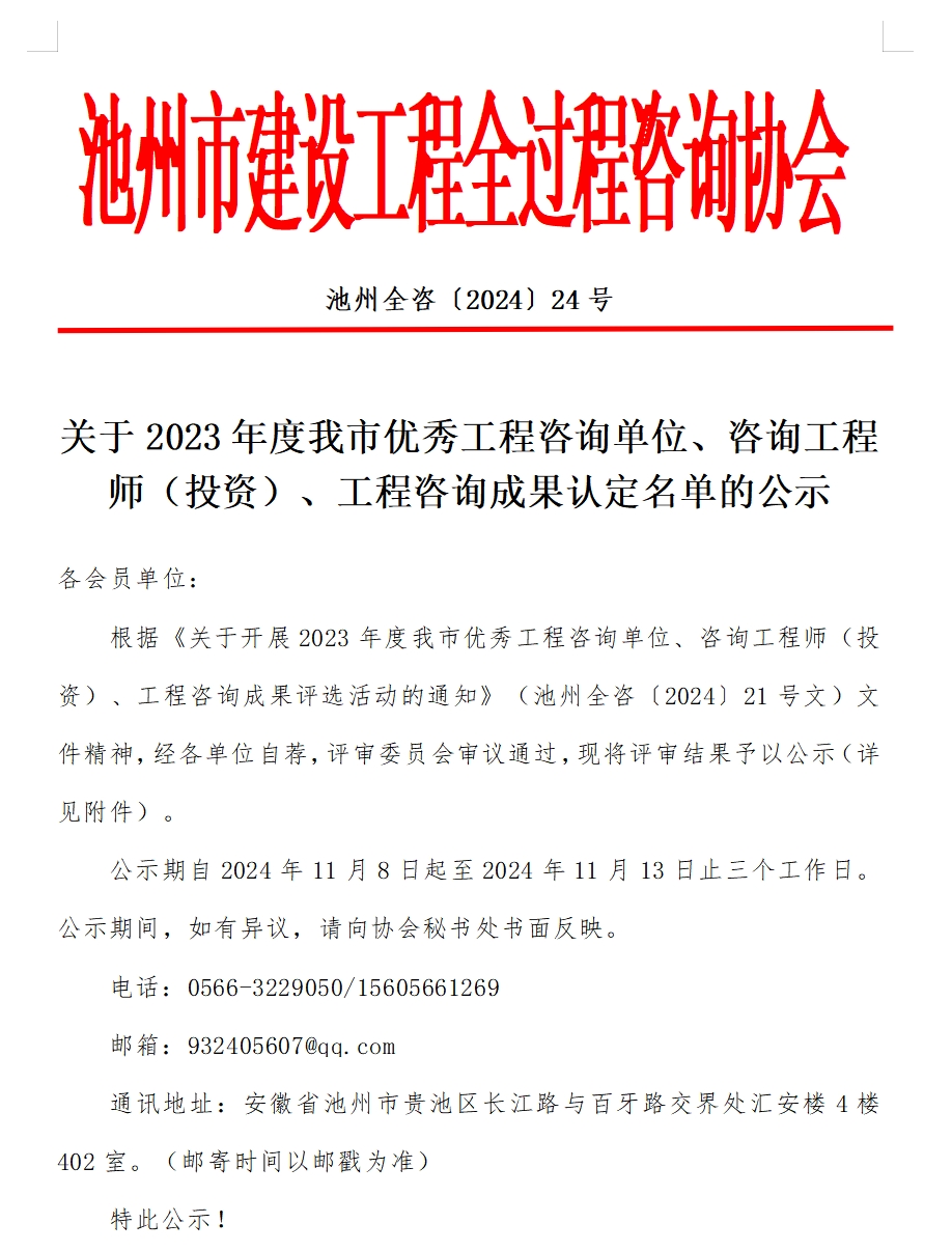 根据《关于开展2023年度我市优秀工程咨询单位、咨询工程师(投资)、工程咨询成果评选活动的通知》(池州全咨〔2024〕21号文)文件精神,经各单位自荐,评审委员会审议通过,现将评审结果予以公示(详见附件)。