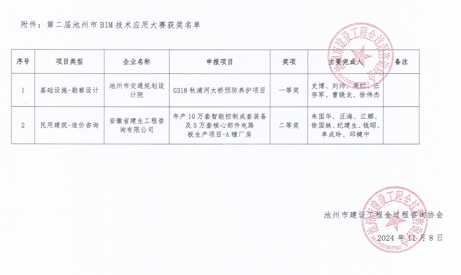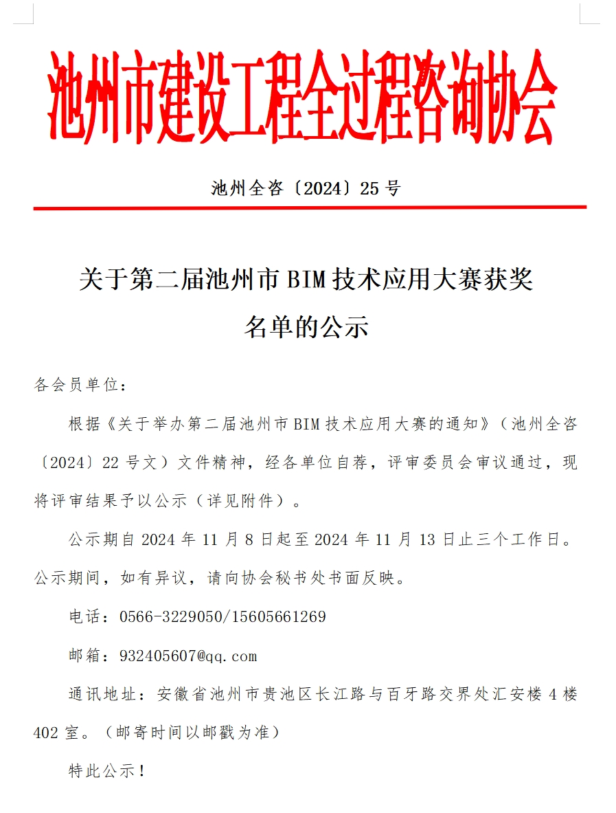 根据《关于举办第二届池州市BIM技术应用大赛的通知》(池州全咨〔2024〕22号文)文件精神,经各单位自荐,评审委员会审议通过,现将评审结果予以公示(详见附件)。