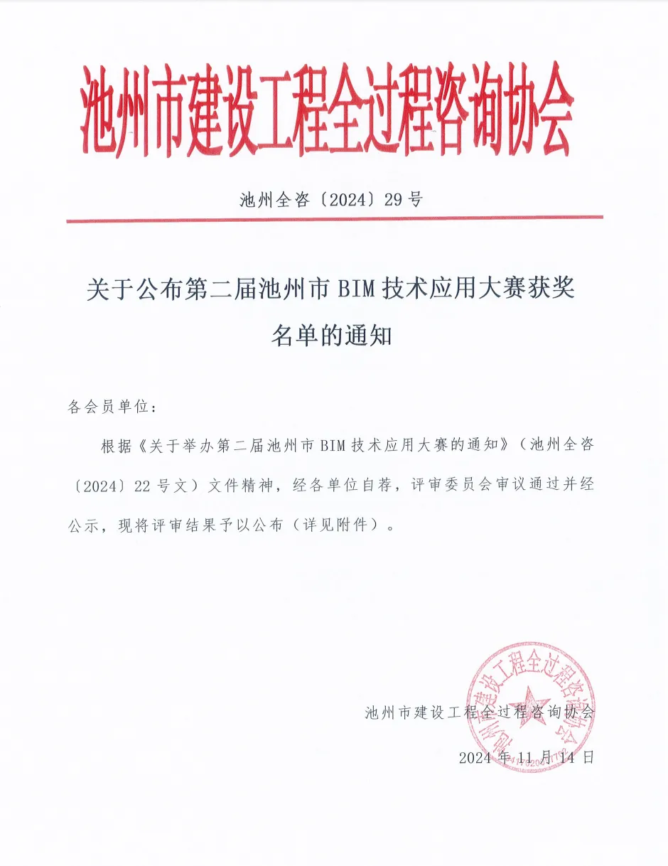 根据《关于举办第二届池州市BIM技术应用大赛的通知》(池州全咨〔2024〕22号文)文件精神,经各单位自荐,评审委员会审议通过并经公示,现将评审结果予以公布(详见附件)。