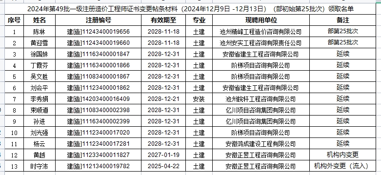 经住房和城乡建设部审批,省住房和城乡建设厅委托,我市收到2024年第49批一级注册造价工程师证书变更帖条材料(2024年12月9日 -12月13日)(部初始第25批次),现将领取有关事项通知如下: