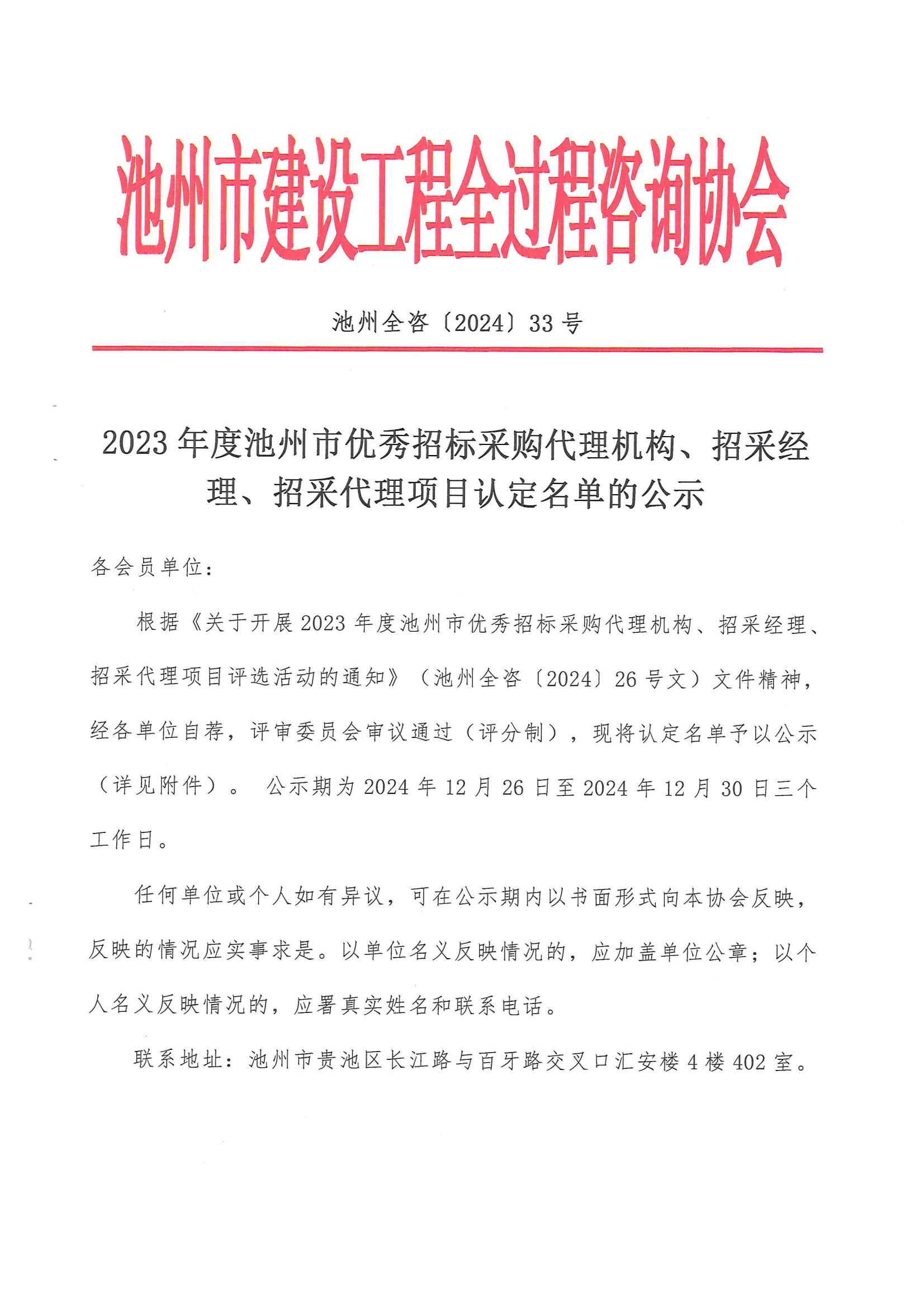 根据《关于开展2023年度池州市优秀招标采购代理机构、招采经理、招采代理项目评选活动的通知》(池州全咨〔2024〕26号文)文件精神,经各单位自荐,评审委员会审议通过(评分制),现将认定名单予以公示(详见附件)。 公示期为2024年12月26日至2024年12月30日三个工作日。