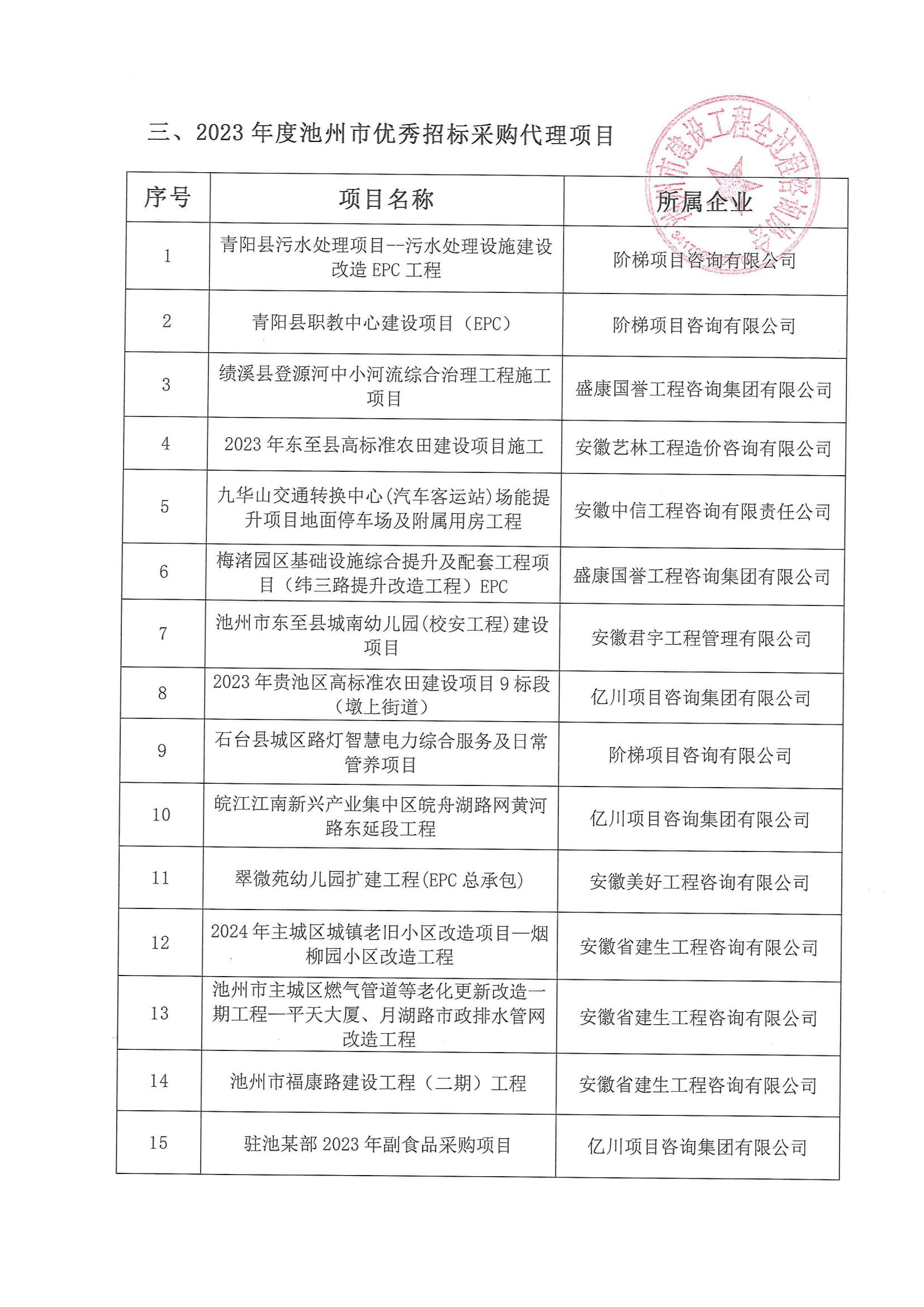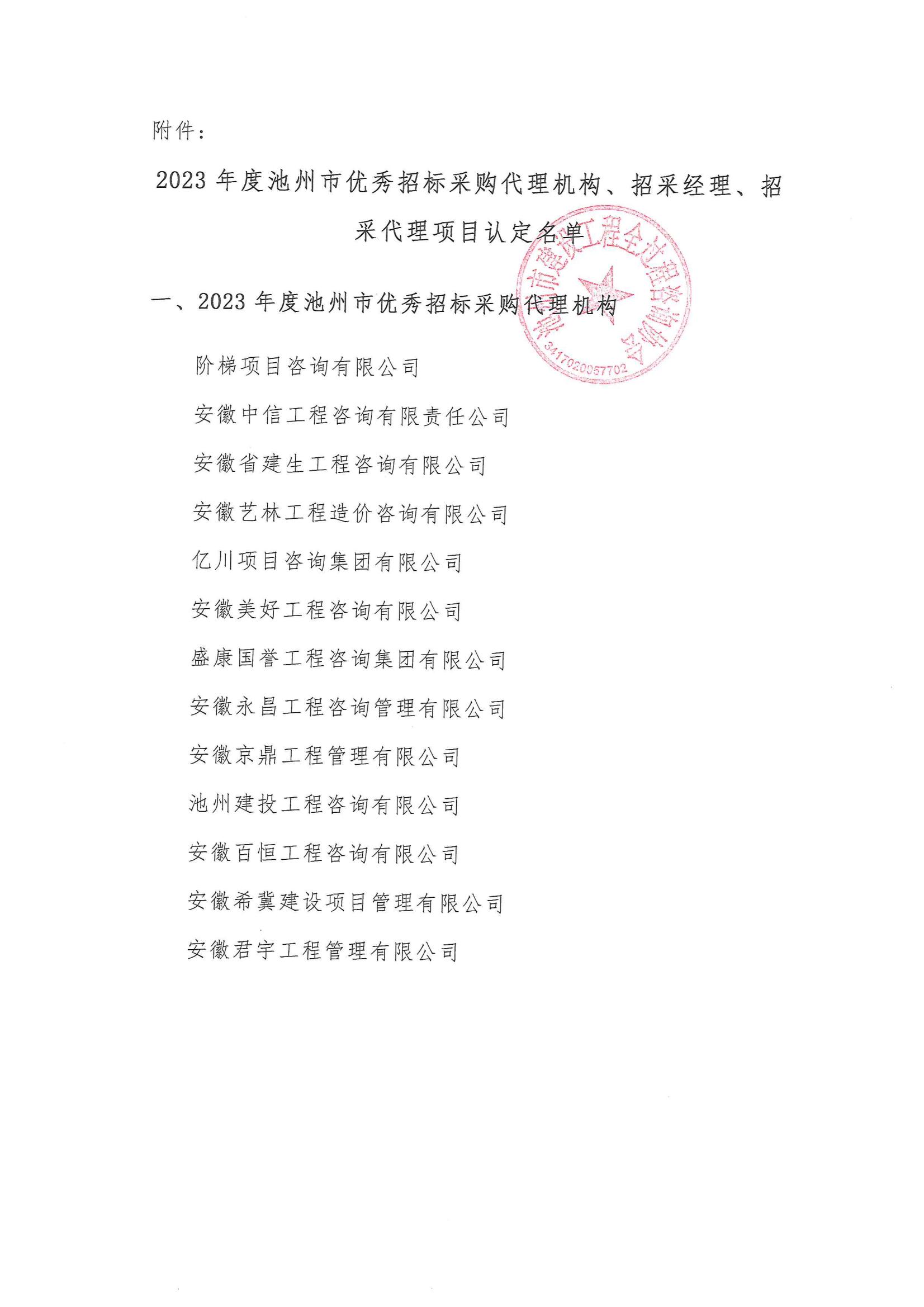 2023年度池州市优秀招标采购代理机构、招采经理、招采代理项目认定名单的公示
