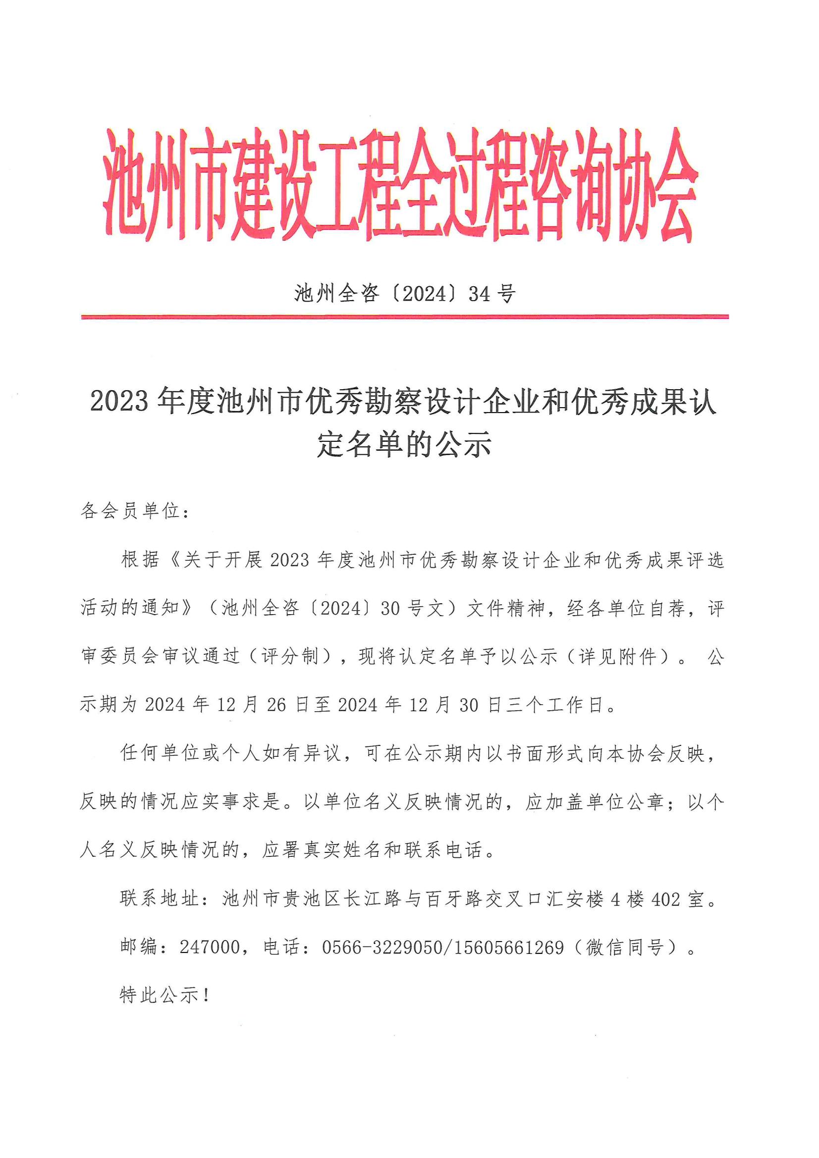 根据《关于开展2023年度池州市优秀勘察设计企业和优秀成果评选活动的通知》(池州全咨〔2024〕30号文)文件精神,经各单位自荐,评审委员会审议通过(评分制),现将认定名单予以公示(详见附件)。 公示期为2024年12月26日至2024年12月30日三个工作日。