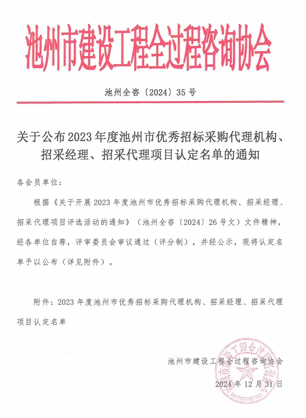根据《关于开展2023年度池州市优秀招标采购代理机构、招采经理招采代理项目评选活动的通知》(池州全咨(2024)26号文)文件精神经各单位自荐,评审委员会审议通过(评分制),并经公示,现将认定名单予以公布(详见附件)。