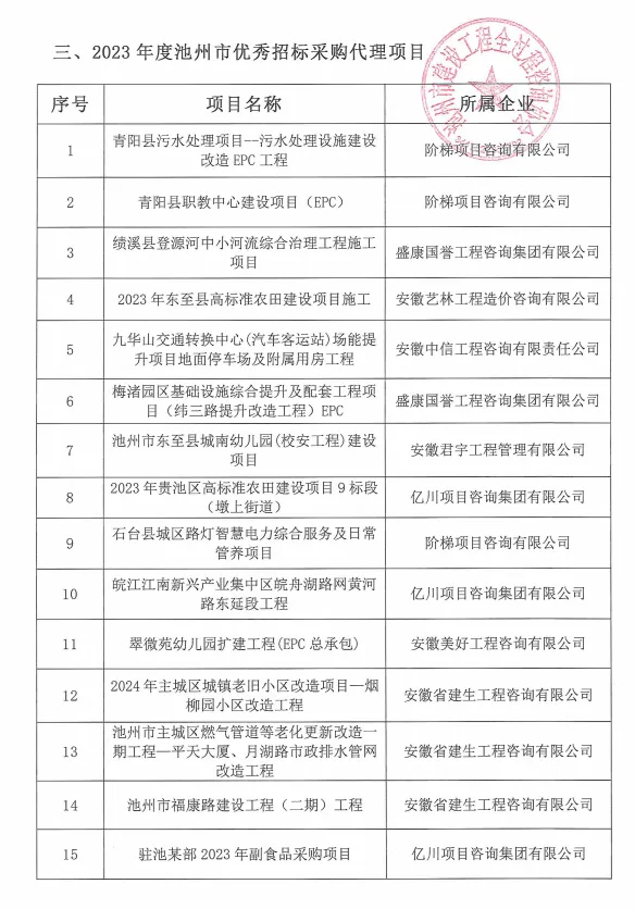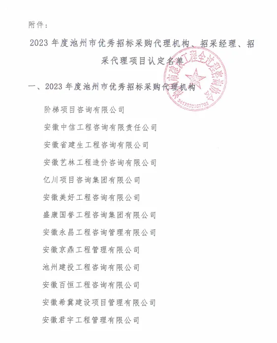 关于公布2023年度池州市优秀招标采购代理机构、招采经理、招采代理项目认定名单的通知