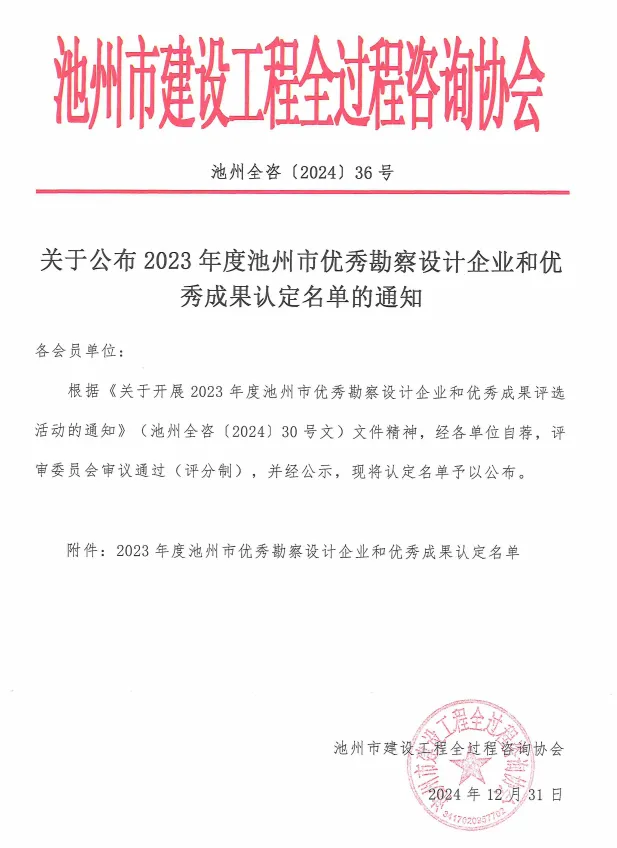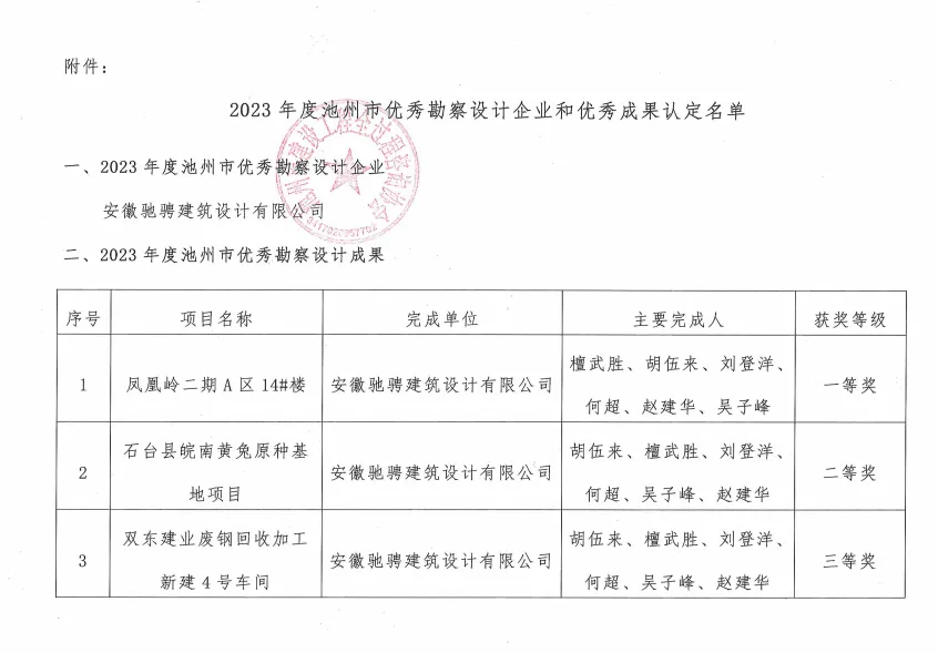 关于公布2023年度池州市优秀勘察设计企业和优秀成果认定名单的通知