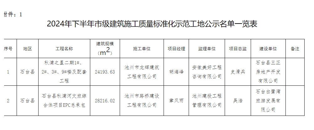 池州市住建局关于2024年度下半年市级建筑施工质量和建筑安全生产标准化示范工地核查结果公示