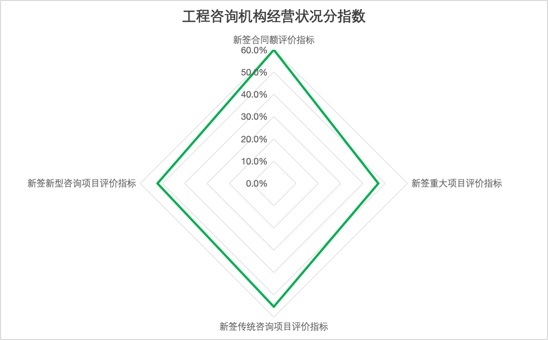 其中,新签合同额评价指标指数为60.0%,表明三季度以来在中央政府各项经济政策的部署实施下,大量投资项目正有序推进、加快落地,工程咨询机构主营业务在2024年四季度实现明显增长。新签传统咨询项目评价指标指数为55.3%,新签新型咨询项目评价指标指数为52.2%,均处在50%荣枯线以上水平,反映工程咨询行业在积极巩固和维护传统工程咨询业务的同时,正在以市场为导向努力开拓新型工程咨询业务,并在四季度取得了一定成绩。