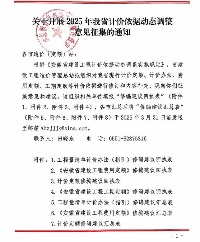 根据安徽省建设工程造价管理总站《关于开展2025年我省计价依据动态调整意见征集的通知》,请各有关单位积极填报“修编建议回执表”,并于2025年3月27日前发送至池州市造价站邮箱chizhouzjz@163.com。