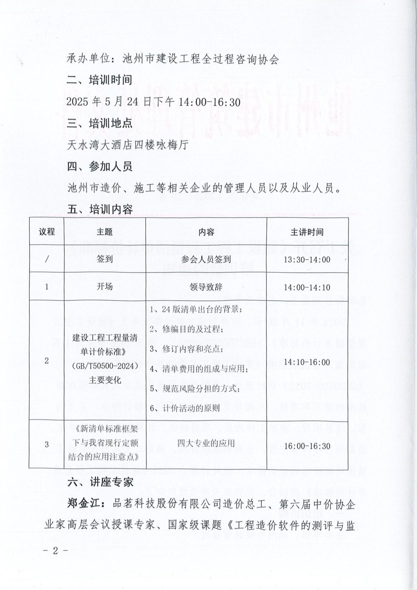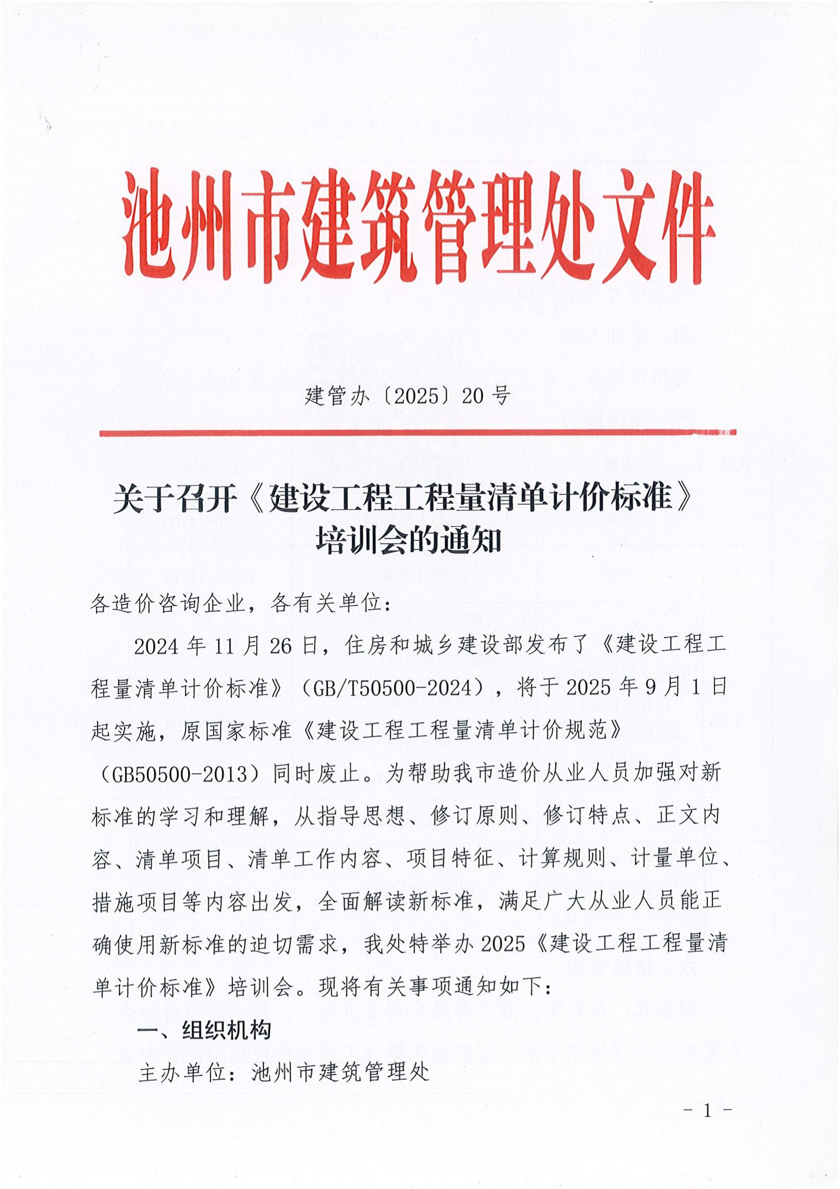 池州市建管处关于召开《建设工程工程量清单计价标准》培训会的通知