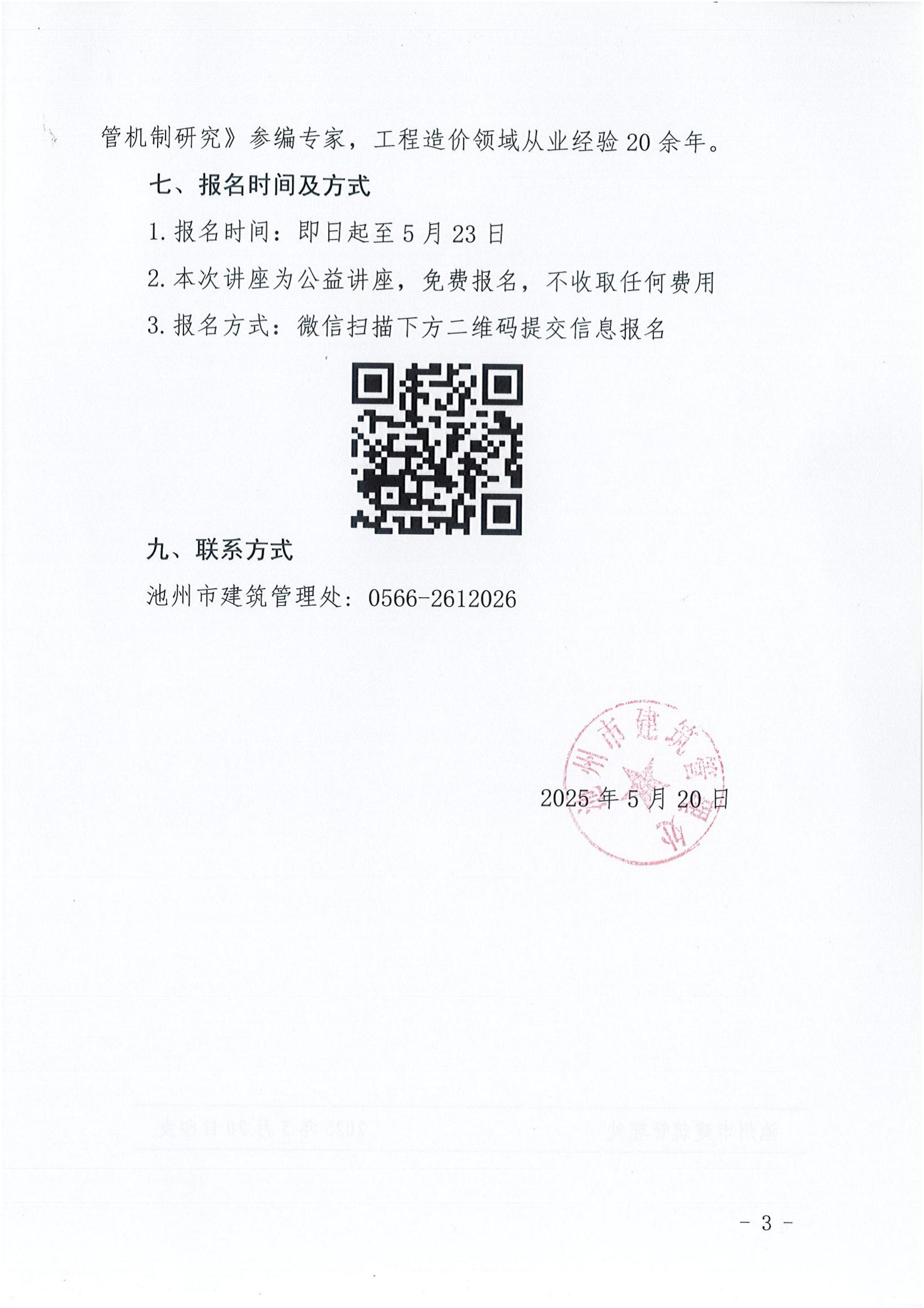 为进一步规范建设工程工程量清单计价管理,准确掌握最新政策要求,池州市建管处定于2025年5月24日14:00在天水湾大酒店咏梅厅召开专题宣贯会,请大家积极报名。