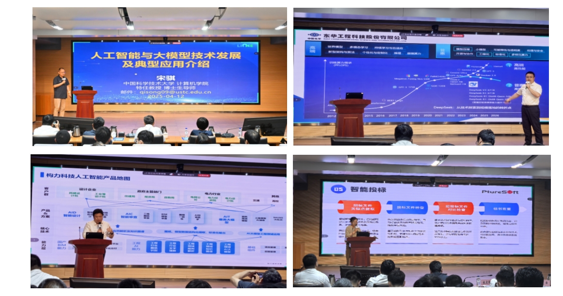 技术交流环节精彩纷呈。中国科学技术大学特任教授宋骐为大家带来《人工智能与大模型技术发展及典型应用介绍》,展示前沿研究成果的同时将丰富的落地实践经验倾囊相授;东华科技高工乌焕涛作《人工智能应用经验分享》,结合东华研究实践,为兄弟单位提供极具参考价值的AI智能体搭建范本,阐释建立安全可靠企业专属大模型的实现路径,并展现其为企业提速减负的强大效能。会议还邀请3家国内知名软件商共同探索AI技术赋能行业转型思路:合肥纯真软件开发有限公司AI产品总监董博宁讲述《从构建到赋能:AI 大模型本地部署与应用拓展》;珠海金智维信息科技有限公司产品总监屈文浩介绍《新质生产力加持,数字员工为企业运营提速减负最佳实践》;北京构力科技有限公司上海分公司总经理张永炜讲解《AI助力建筑设计创新与发展》。