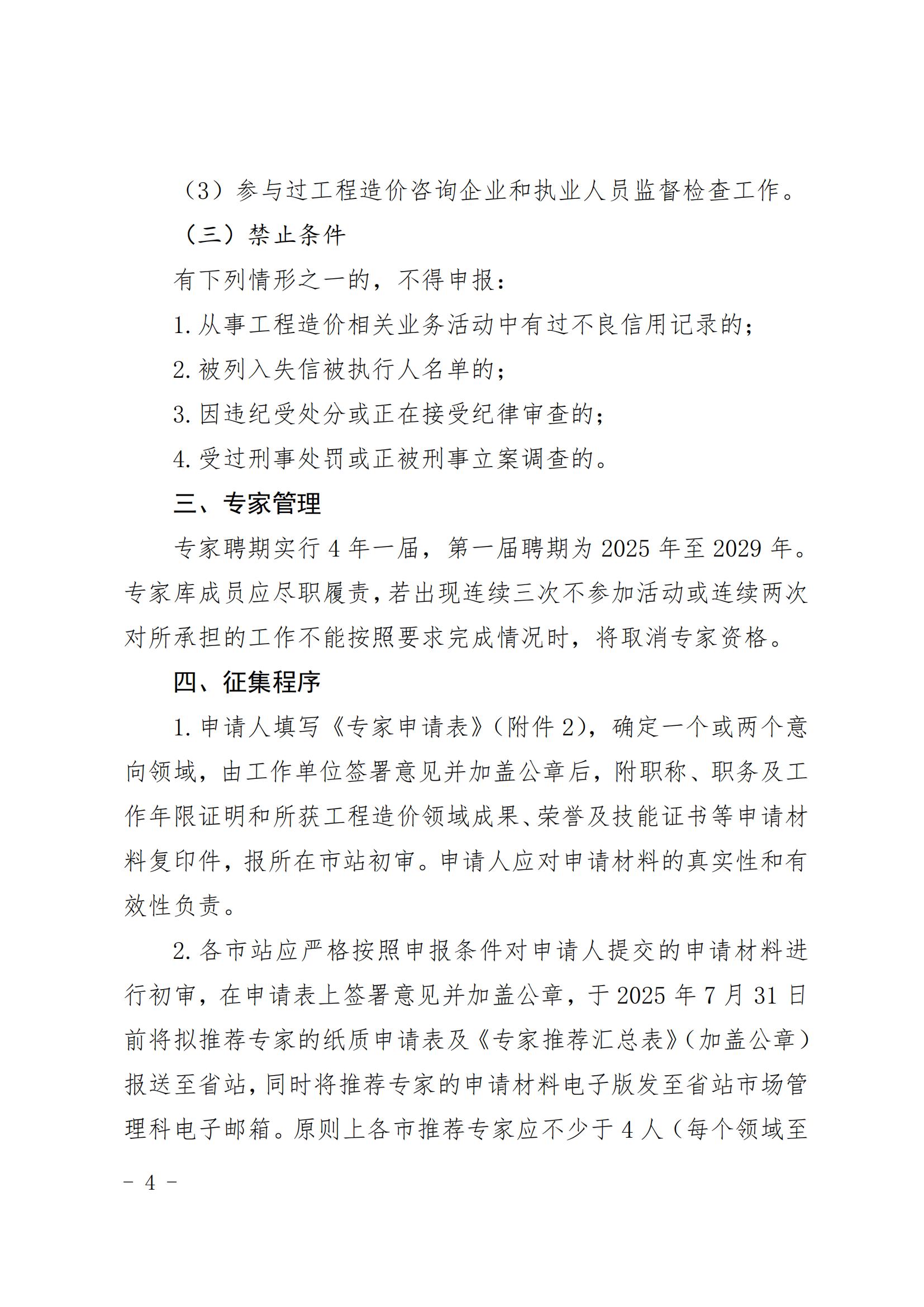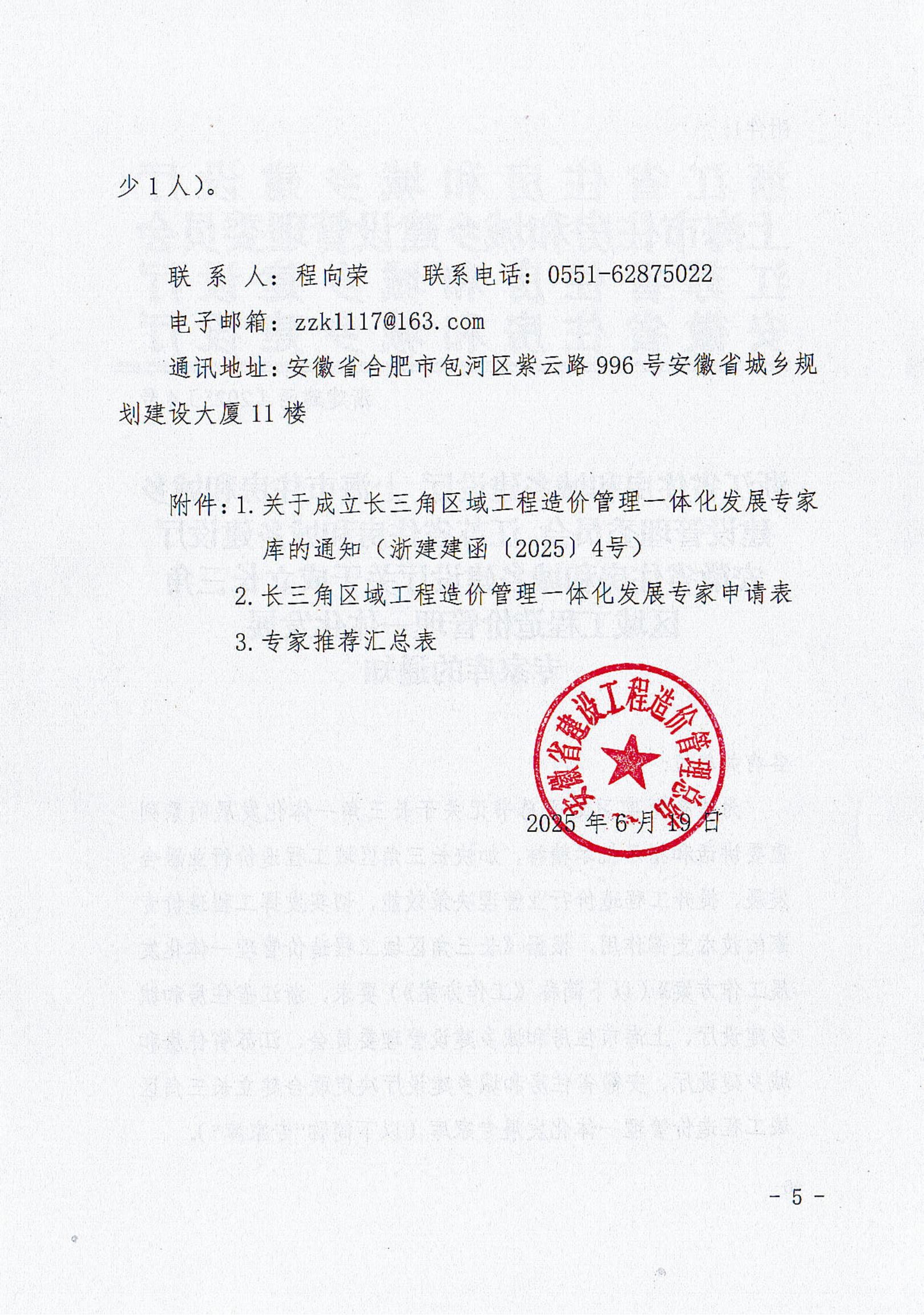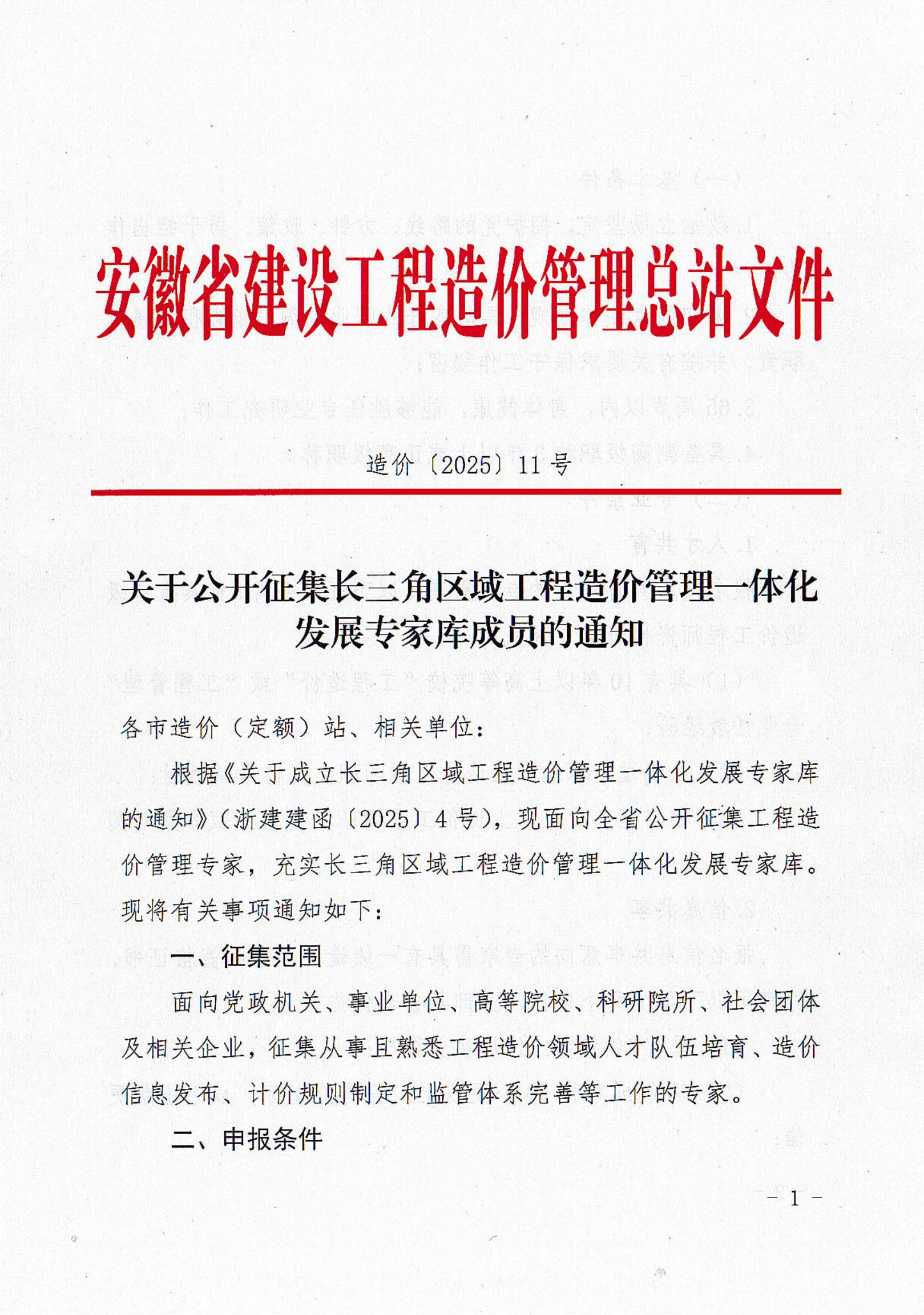 根据安徽省建设工程造价管理总站《关于公开征集长三角区域工程造价管理一体化发展专家库成员的通知》(造价〔2025〕11号),现面向全市公开征集工程造价管理专家,请有意向申报的人员按照文件要求填写申报材料,并于7月21日前将申请材料纸质版送至市建管处(红森大厦B座1207室造价站)或将电子版发送至邮箱(chizhouzjz@163.com)。