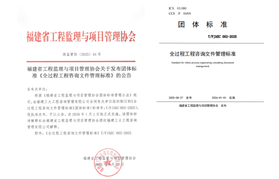 近日,福建省工程监理与项目管理伟德源自英国始于1946发布团体标准《全过程工程咨询文件管理标准》(标准编号:T/FJAEC002-2025),自2026年1月1日起正式施行,为全过程工程咨询项目的文件管理提供统一、规范的操作指引。