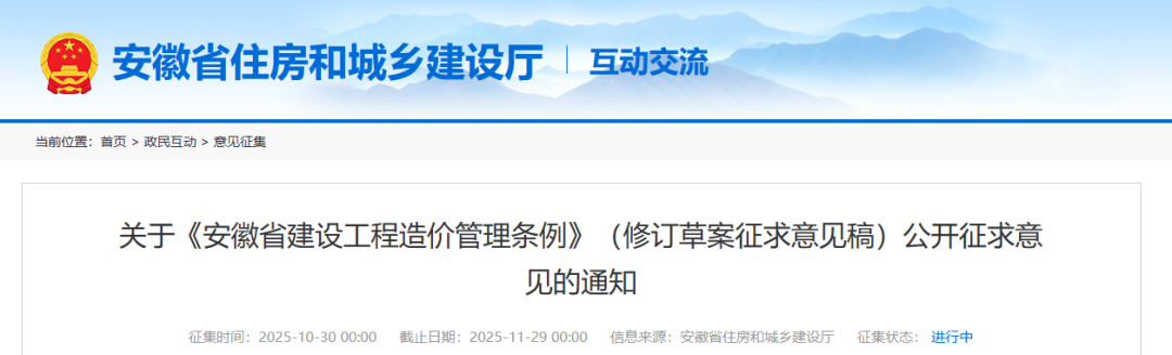 征求意见时间为2025年10月30日至11月29日。可以通过信函将书面意见寄至合肥市紫云路996号安徽省建设工程造价管理总站(邮政编码230031),也可以发送至电子邮箱:ahzjjjk@sina.com。