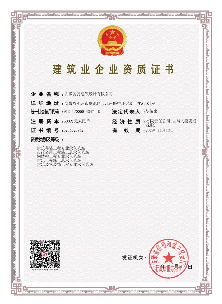 安徽驰骋建筑设计有限公司成立于2007年5月8日,资质完备,持有安徽省住房和城乡建设厅颁发的多项资质证书,涵盖设计、施工、检测三大领域:设计类包括建筑行业建筑工程、建筑装饰工程、建筑幕墙工程、轻型钢结构工程设计乙级;施工类包含建筑工程施工总承包、市政公用工程施工总承包、建筑装修装饰工程专业承包、建筑幕墙工程专业承包、建筑钢结构工程专业承包贰级;同时拥有检验检测机构资质证书。